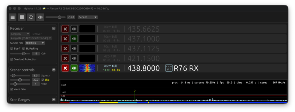 На відміну від класичних сканерів, які перебирають частоти по одній, Mykola SDR аналізує широку смугу частот одночасно, дозволяючи “бачити” і “чути” все, що відбувається в межах можливостей вашого SDR-приймача.